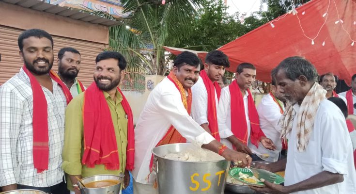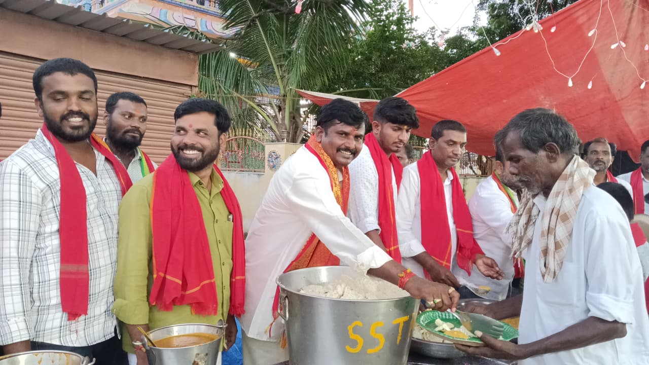 అనంతరం అన్నదాన వితరణ కార్యక్రమాన్ని కుటుంబ సమేతంగా నిర్వహించారు. ఈ సందర్భంగా ఉత్సవ కమిటి సభ్యులు బంటు మల్లప్పను సతీసమేతంగా సన్మానించారు.ఈ కార్యక్రమంలో కుటుంబ సభ్యులతో పాటు స్థానిక యువకులు, అభిమానులు, మిత్రులు 9వ వార్డు ప్రజలు తదితరులు పాల్గొన్నారు.